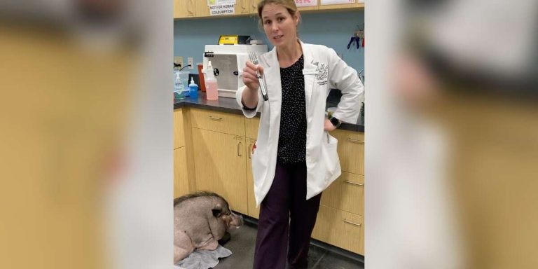 Bien que les cochons soient adorables, ils peuvent aussi être plutôt effrontés et avoir leur propre esprit. Il peut parfois être difficile d’amener un cochon à accepter de rester calme lors d’un examen, c’est pourquoi le Dr Salina Locke a une fourchette à cochon désignée.
